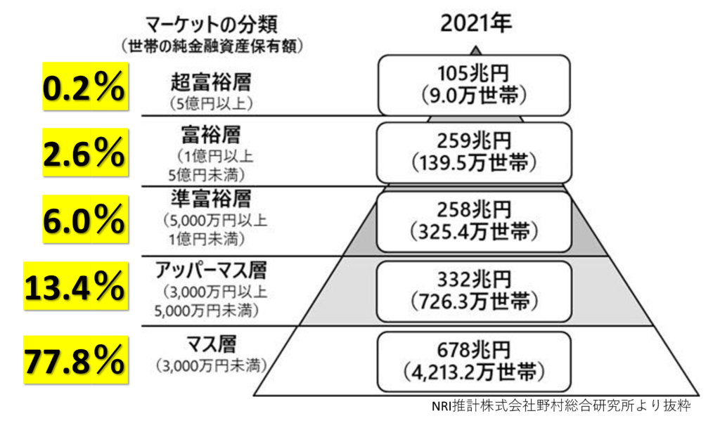 まずは日本全体の77.8%がマス層(金融資産3,000万円未満)から13.4%のアッパーマス層に(金融資産3,000万以上5,000万未満)にステップアップできるように頑張っていきます!