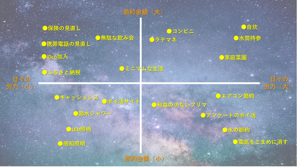 無理のない範囲で、下記の節約マトリックスをみて試してみてはいかがでしょうか?